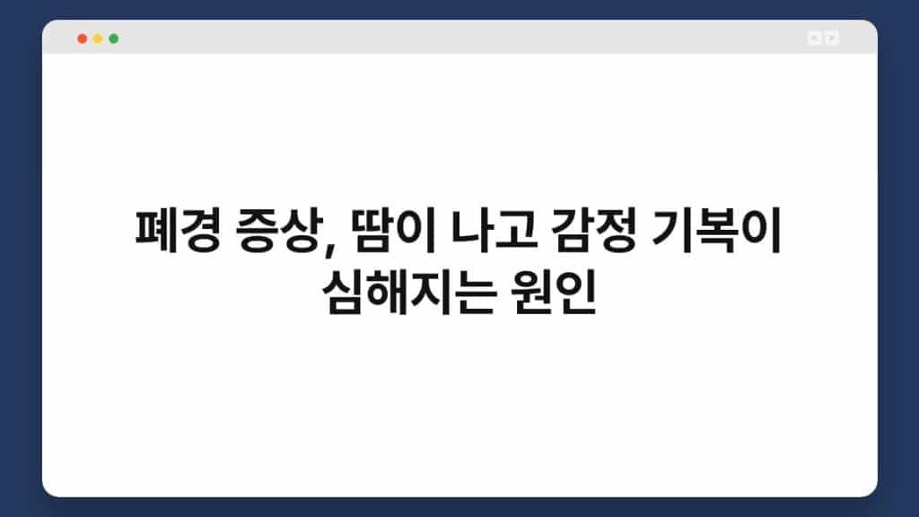 폐경 증상은 여성의 생리 주기가 종료되면서 나타나는 다양한 신체적, 정서적 변화입니다. 이 시기는 보통 40대 후반에서 50대 초반에 발생하며, 각 ...
